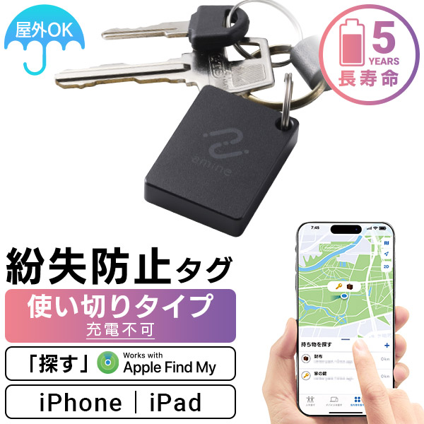 キーホルダーのように鍵やカバンなどに付けておける、タグ型のiPhone・iPad対応スマートタグです。充電や電池交換の必要がない使い切りタイプで、なくしたくないものに付けた状態で最大5年間使うことができます。
