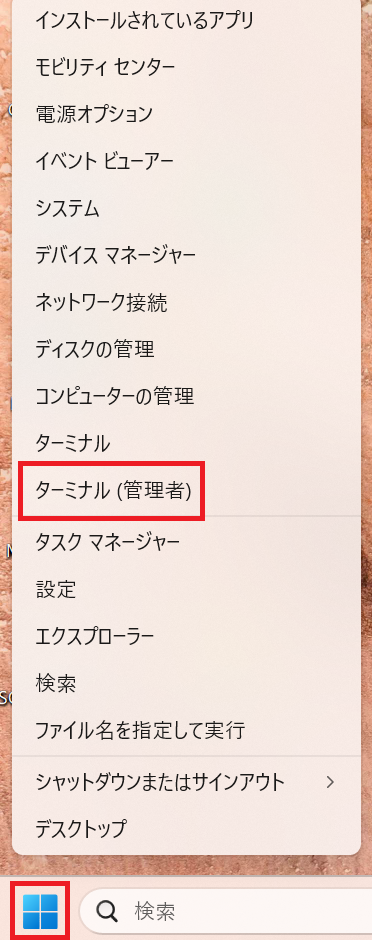 - 「スタート」ボタンを右クリックし、表示されたメニューから「ターミナル(管理者)」をクリックする