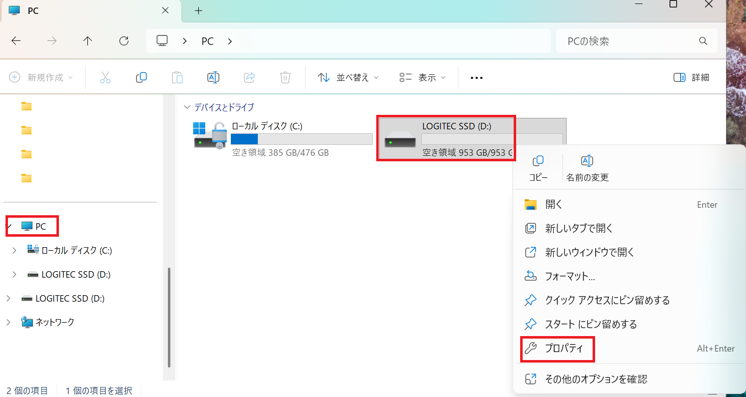 - エクスプローラーを開いて左メニューから「PC」を選択し、表示された画面で任意のディスクを右クリックして「プロパティ」を選択する