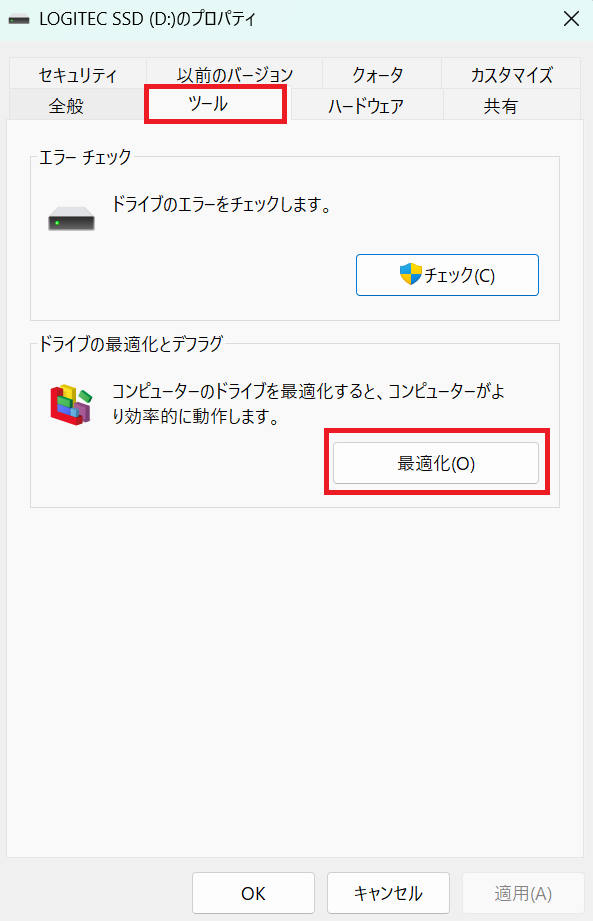 - プロパティが開いたら「ツール」タブを選択して「最適化」をクリックする