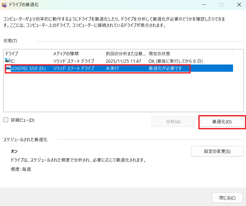 - 「ドライブの最適化」ツールが起動するので、トリムを実行したいドライブを選択して「最適化」をクリックすると、自動でトリムが実行される(SSDの場合)