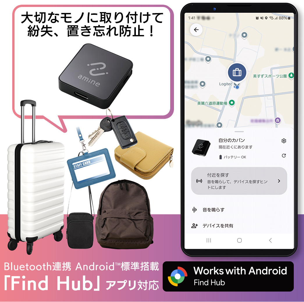 Googleの「Find Hub」アプリから位置を確認!鍵や財布、かばんなど大切な荷物に付けて位置情報を追跡できるタグ型の紛失防止タグです。専用アプリ・ソフトのダウンロードは不要。鍵、財布、旅行バッグ、パソコンケースなど、失くしたくないものに付属させておくと、置き忘れや紛失した際、探しやすくなります。BluetoothでAndroid(TM)と連携し、標準搭載されている「Find Hub」アプリに登録するとタグの位置が地図上に表示され、位置情報を特定することができます。