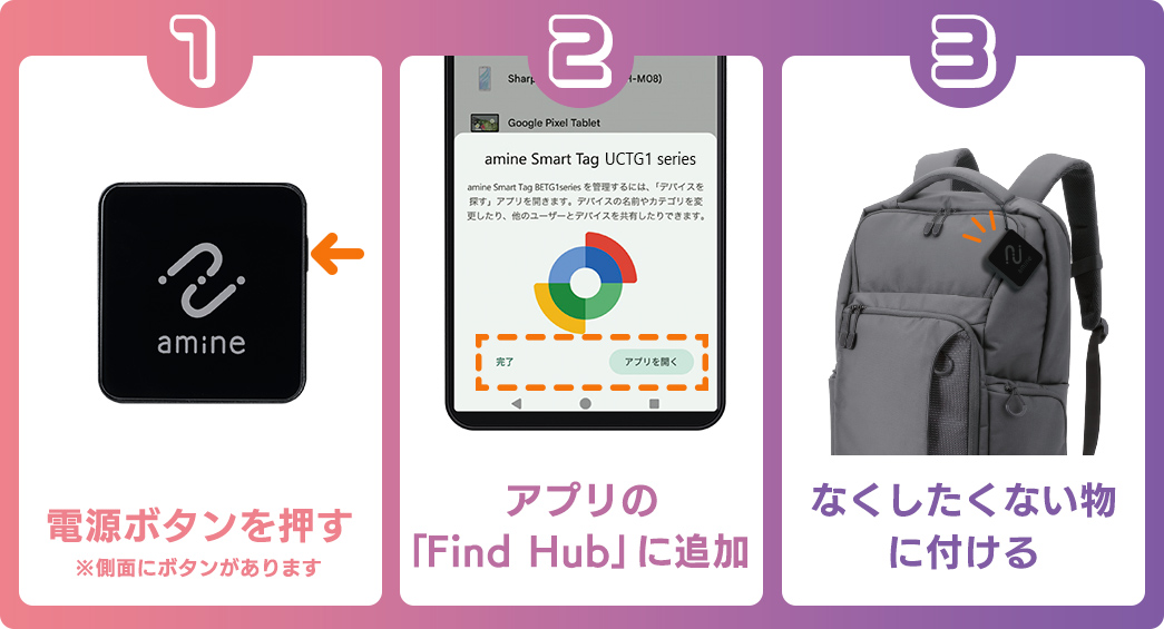 電源ボタンを押す > Android(TM)スマートフォン・タブレットの「Find Hub」アプリに登録 > 大切な荷物に付ける の3ステップのかんたん設定!位置情報はアプリからいつでも調べることができます。