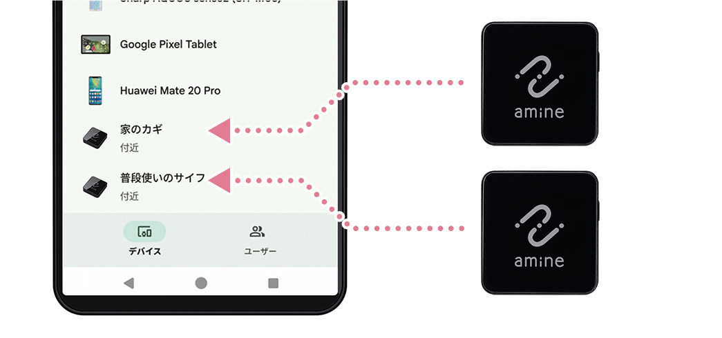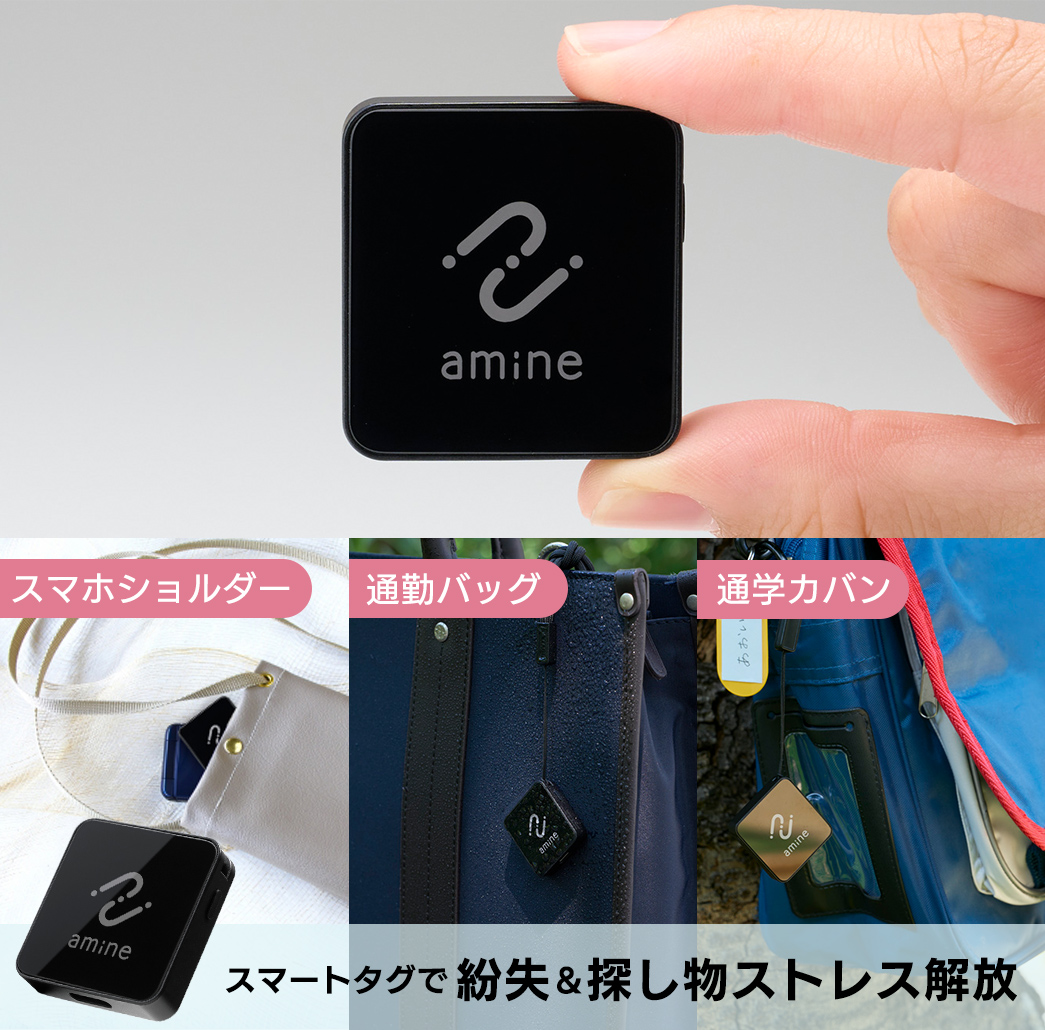 iPhoneの「探す」アプリから位置を確認!鍵や財布、かばんなど大切な荷物に付けて位置情報を追跡できる紛失防止タグ【amine(あみね)シリーズ】で、置き忘れ防止や紛失した際にスマートフォンを使ってすぐに探し出すことが可能です。