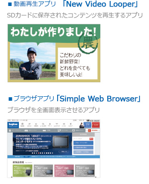 「動画再生アプリ」と「ブラウザアプリ」を2本追加しました。いずれのアプリも自動起動、全画面表示に対応しているため簡易サイネージとしてすぐに利用可能です。
